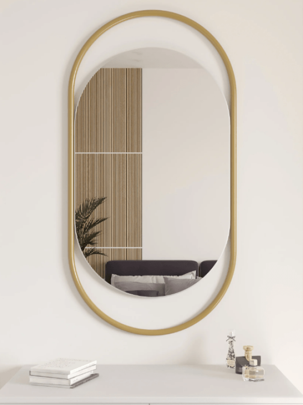 Зеркало «Muse». Артикул GMZ-02-1-1/2/3 Идеальная симметрия и простая изысканность ар-деко в виде овального настенного зеркала в металлической раме способны дополнить интерьер, выполненный в любом стиле, начиная от винтажного и заканчивая авангардным. Зеркальное полотно является продукцией известного бельгийского производителя AGC, который славится непревзойдённым качеством своих зеркал. Идеально подходит для ванной комнаты или спальни.Характеристики:– профиль рамы круглый, диаметром 20 мм; – габариты – 1040х540х20 мм; – размер зеркального полотна – 800х500 мм, толщина – 4 мм; – вес – 7 кг; – устойчивая матовая порошковая окраска; – возможные цвета – золотой, чёрный, белый; – саморезы для крепления к стене в комплекте; – гарантия – 1 год.